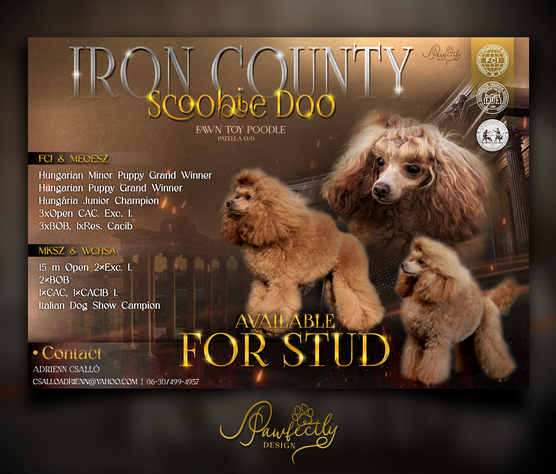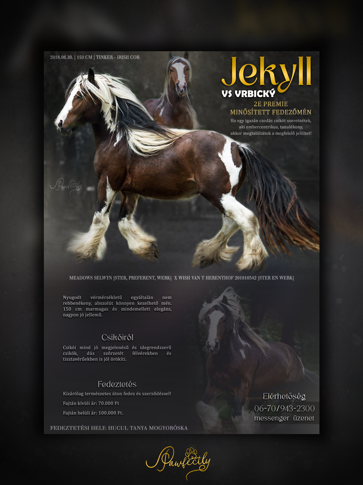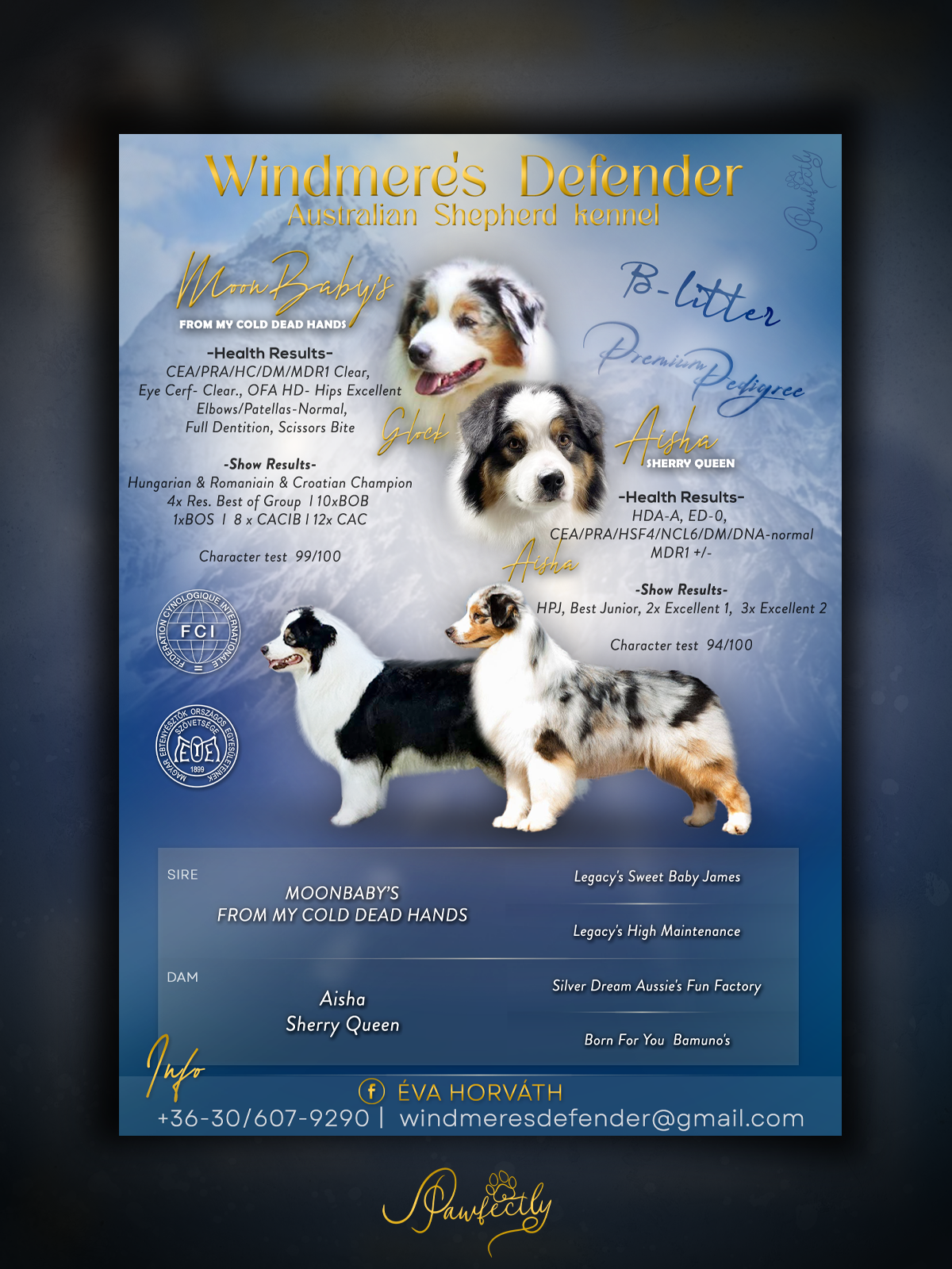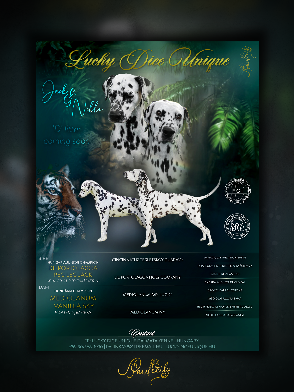 - Elérhetőség, kennel név ami megjelenik a plakáton
